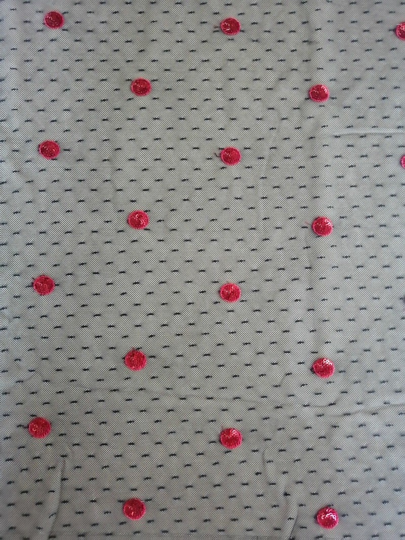 Evidenziare: | Polka rossa nera Dot Sequin Fabric,Polka Dot Sequin Fabric dell'indumento del vestito da giorno,Tessuto ricamato dello zecchino amichevole della pelle |