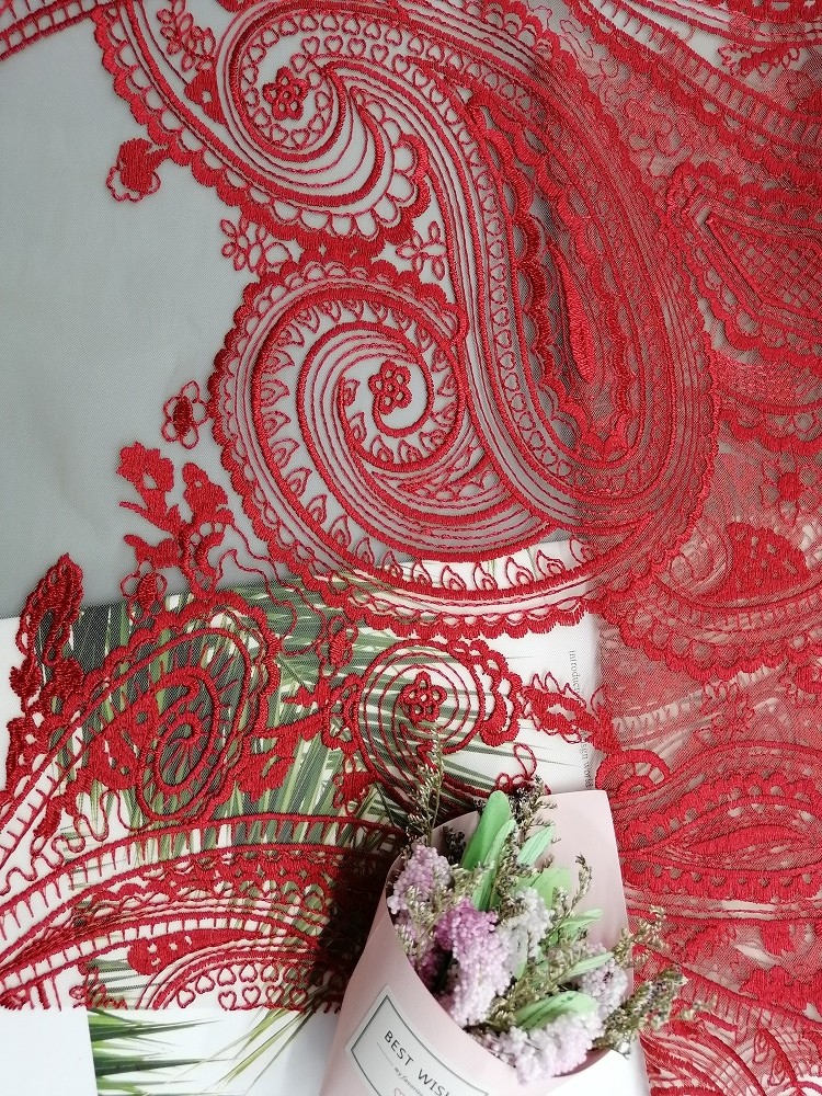 - Il tessuto rosso del pizzo di Paisley del tessuto di Tulle Mesh Bridal Dress Colored Embroidery è adatto a donne, a ragazze, a signore, a sposa, a nozze, a partito, a compleanno ed a qualunque altra occasione.