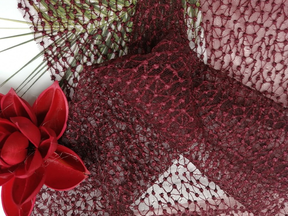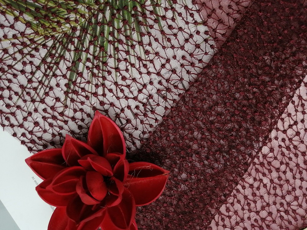 - Il tessuto di Dot Tulle Mesh Embroidered Lace di colore rosso del vino per gli articoli nuziali della lettiera del vestito dall'indumento delle donne può soddisfare la richiesta della norma 100 di OEKO-Tex.