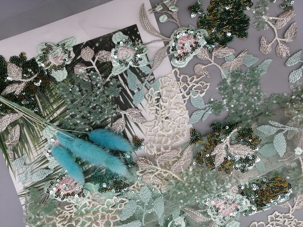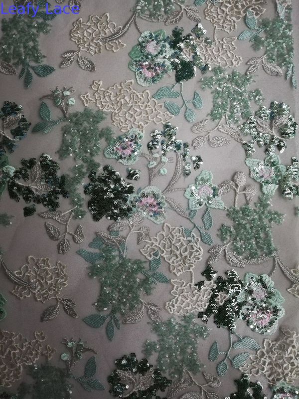 Il tessuto floreale verde del partito del tessuto ricamato dello zecchino per il vestito dalla bambina del Dress Garment Brands del vestito da sera di signora può soddisfare la richiesta della norma 100 di OEKO-Tex.