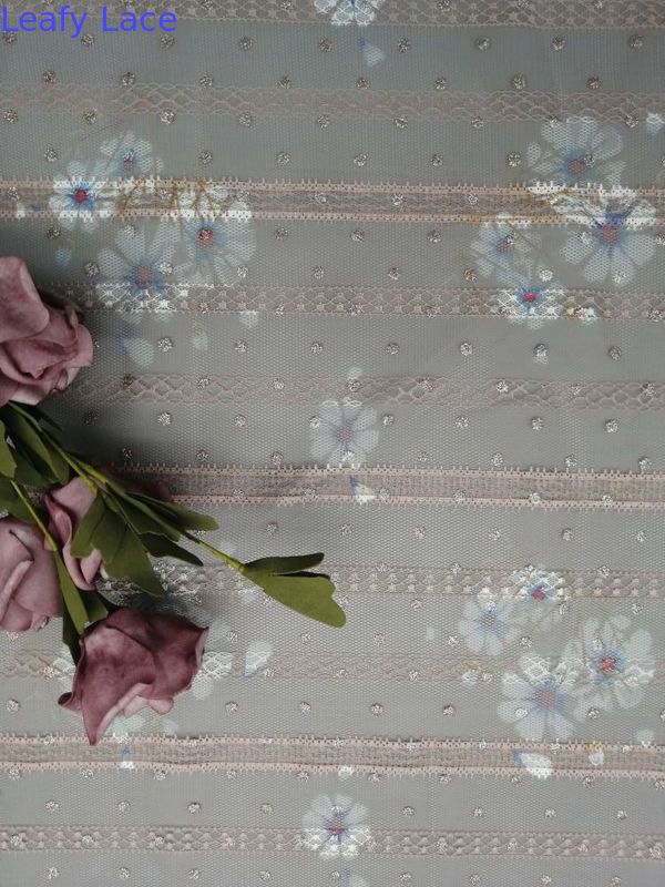 Sventi stampando la stagnola di Tulle è fatto di stampa del pizzo di Tulle insieme per sventare la stampa. Il primo facciamo la stampa digitale su pizzo Tulle e poi facciamo la stampa della stagnola sul backgroud stampato del pizzo di Tulle. Piccoli del pois piccoli creats del fiore della margherita insieme un Design.2000yards meraviglioso abbastanza progettazione per la vostra selezione.