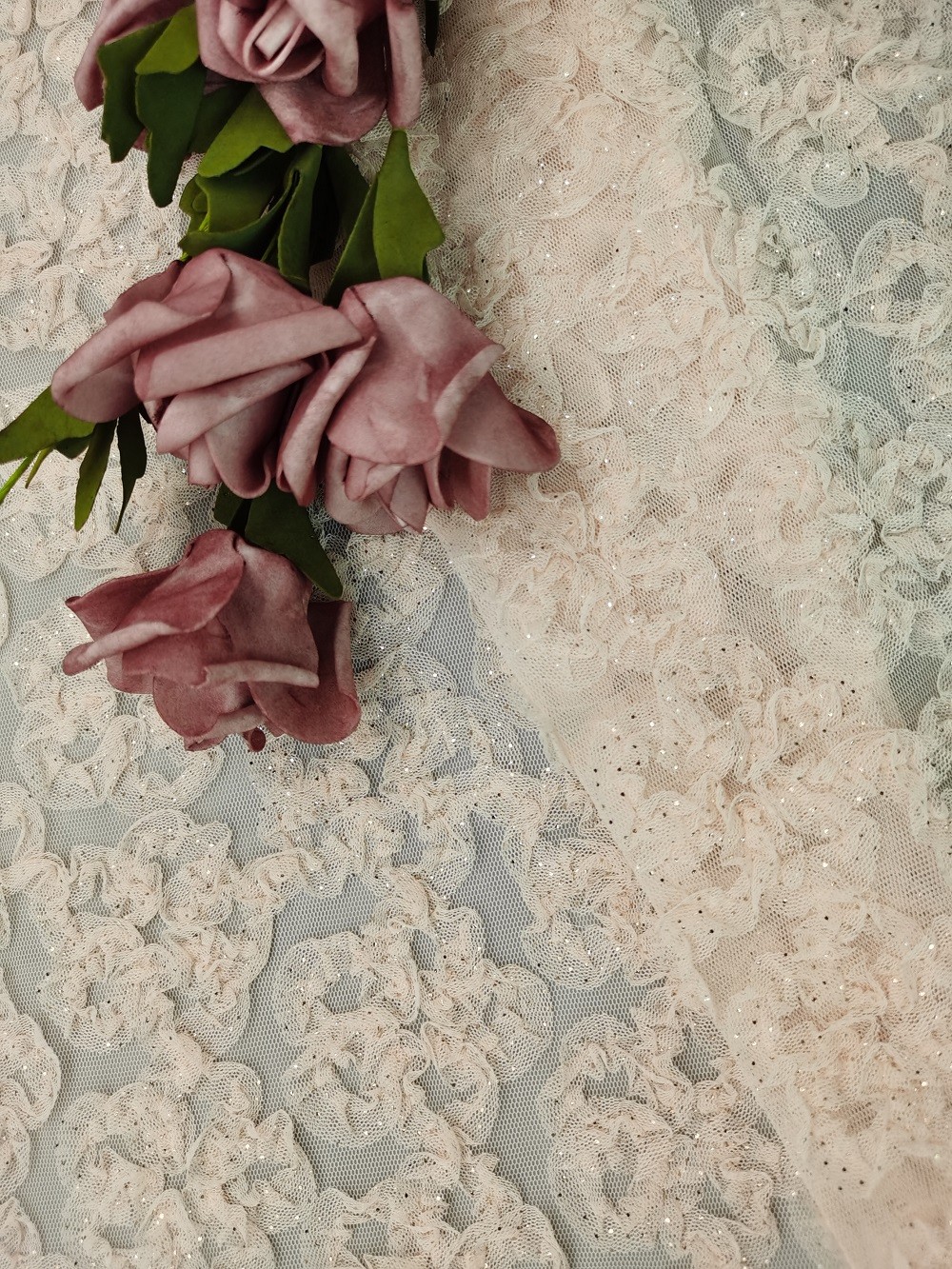 - Materiale: -il tessuto floreale del pizzo all'uncinetto 3D è fatto di 100%polyester con scintillio che rivestito della stagnola .3D la progettazione floreale di effetto è ricamata sul tessuto di maglia.
