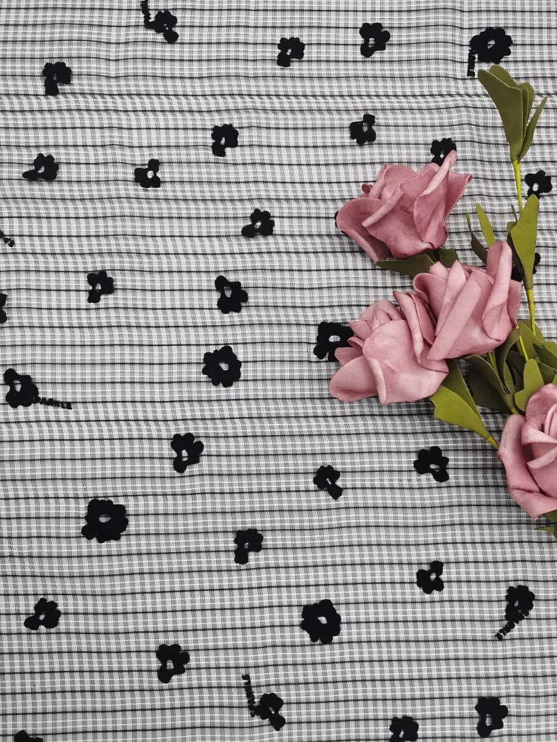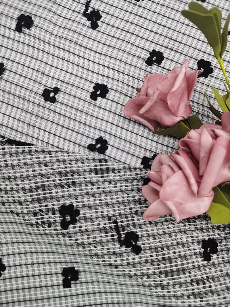 - Materiale illustrativo: Il fiore Tulle si è affollato la maglia è in tintura del pezzo in primo luogo e poi fanno folcking sulla maglia tinta. È colore di contrasto in bianco e nero.
