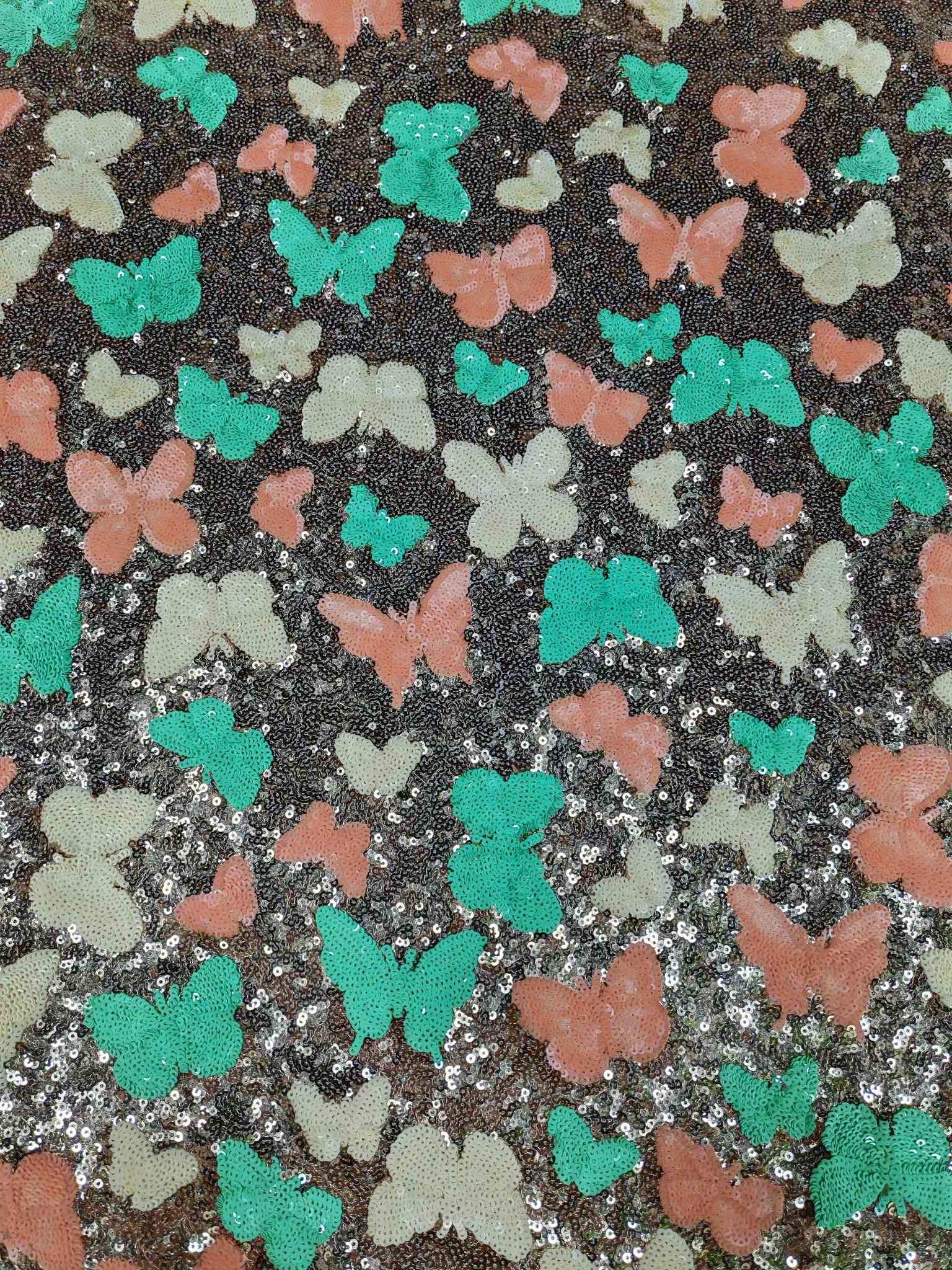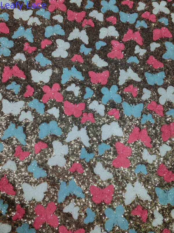 Il tessuto ricamato a sequin è dotato di una base a maglia in nylon al 100%, che fornisce una base morbida e leggera per il ricamo.La superficie del tessuto è costituita per il 95% da poliestere e per il 5% da fili metalliciQuesto tessuto è perfetto per creare abiti eleganti e accattivanti che fanno sicuramente una dichiarazione.