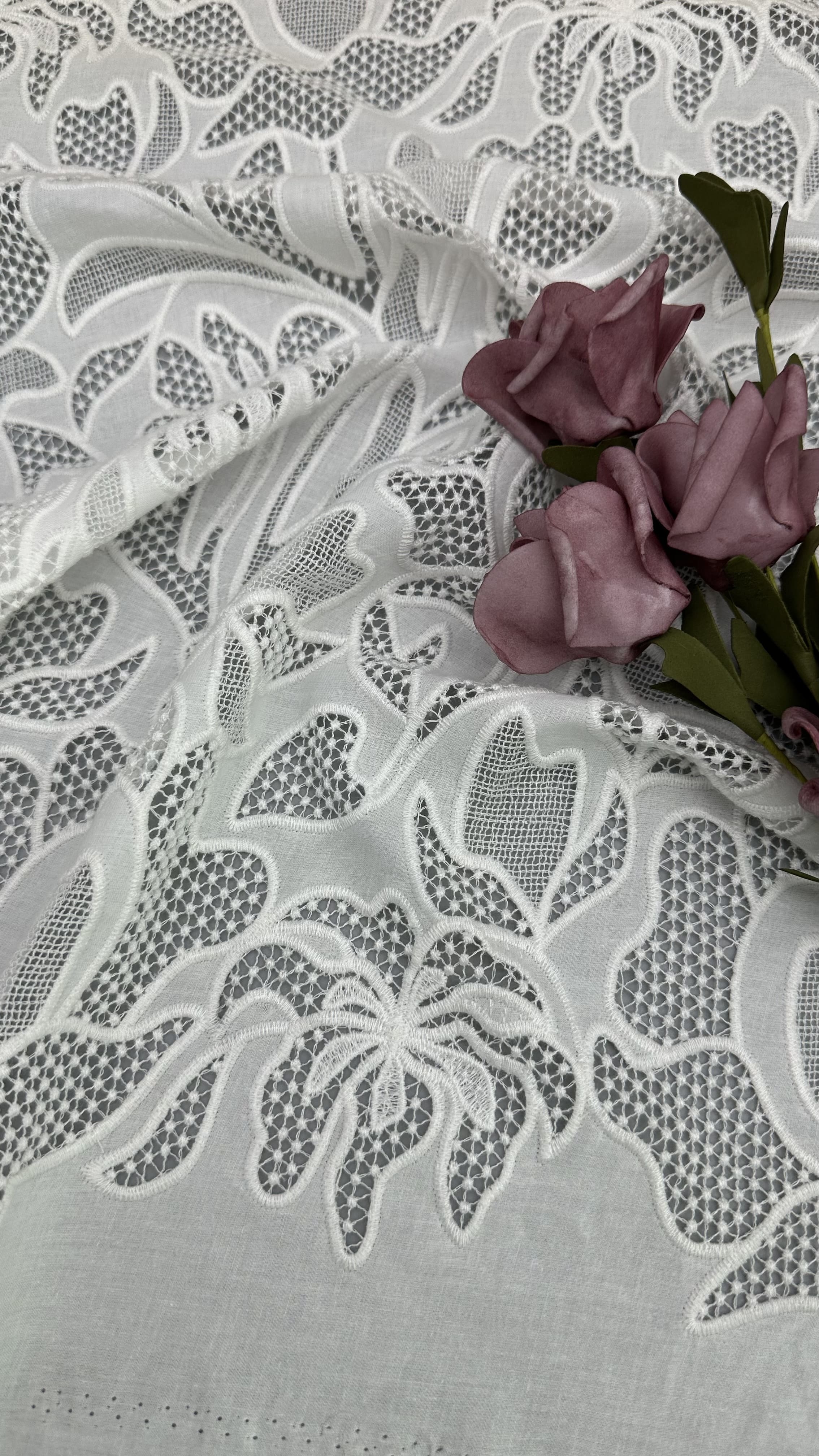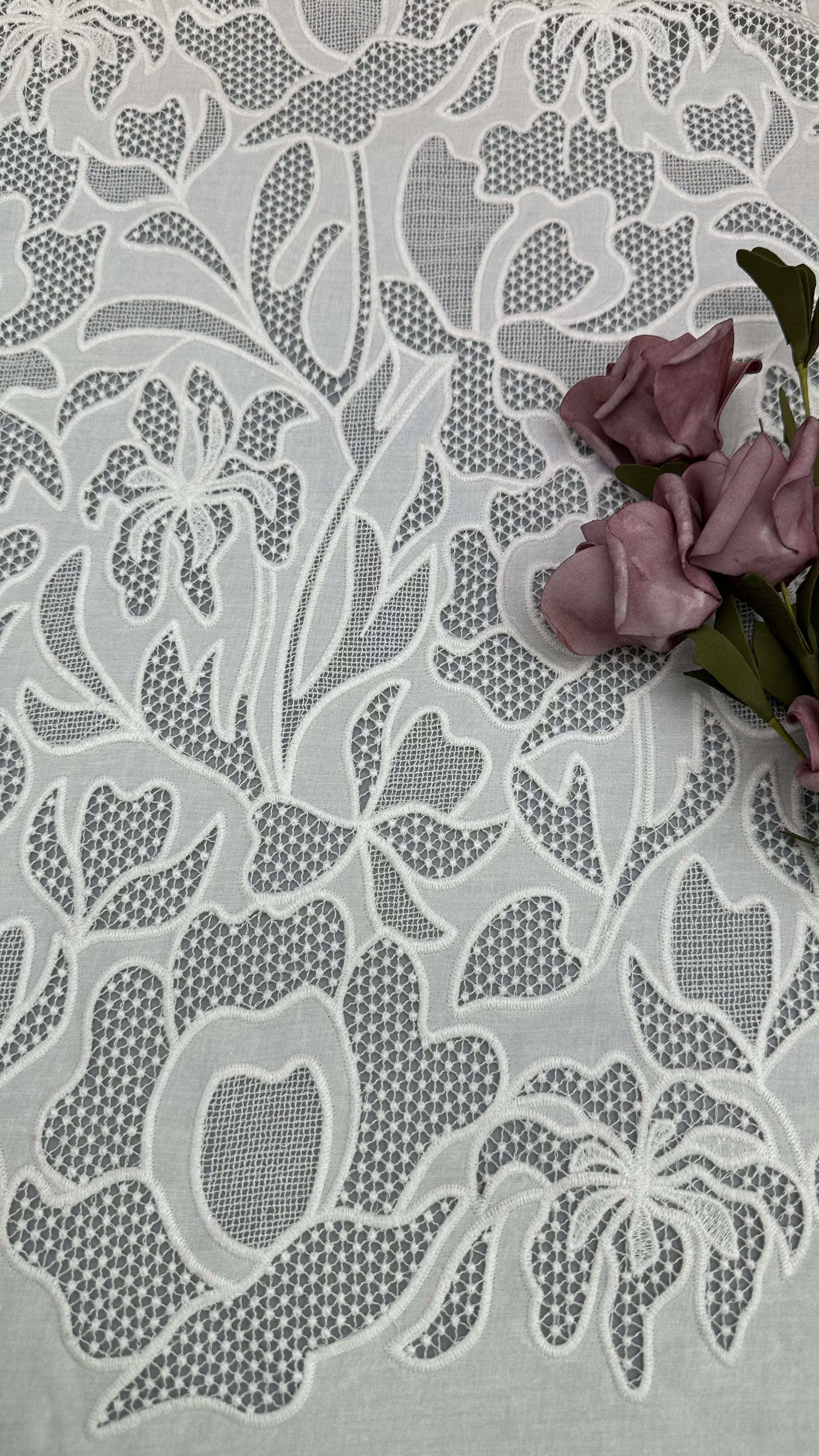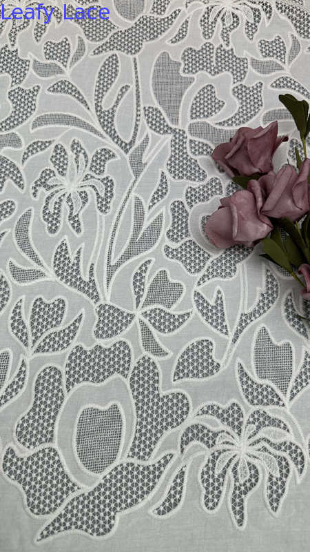 Il tessuto ricamato in pizzo con delicati motivi di foglie è una scelta popolare per abiti da sposa e da festa, che offrono eleganza, consistenza e dettagli complessi.La tecnologia di produzione è una miscela di artigianato tradizionale e innovazioni tessili moderne.