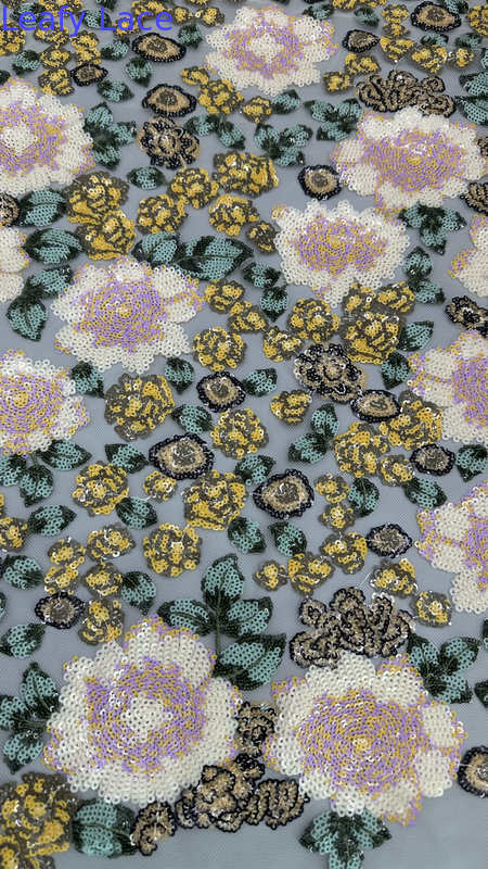 Il tessuto ricamato in pizzo con delicati motivi di foglie è una scelta popolare per abiti da sposa e da festa, che offrono eleganza, consistenza e dettagli complessi.La tecnologia di produzione è una miscela di artigianato tradizionale e innovazioni tessili moderne.